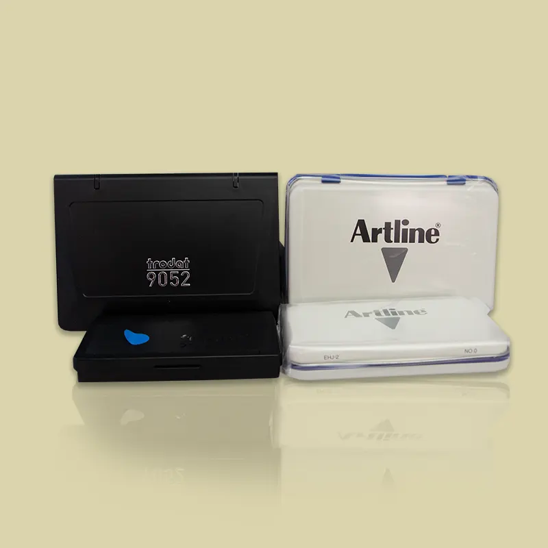 แป้นน้ำหมึกมีทั้งชนิดที่สามารถเติมน้ำหมึกเชื้อน้ำและโซลเว้นท์ เช่น แป้นน้ำหมึกตรา TRODAT และชนิดที่สามารถเติมน้ำหมึกชนิดแห้งเร็วเชื้อโซลเว้นท์โดยเฉพาะ คือ แป้นน้ำหมึกตรา TAT ซึ่งทั้งสองชนิดนั้น ใช้กับด้ามตรายางธรรมดาที่ใช้มือจับประทับ น้ำหมึกเชื้อน้ำนิยมใช้กับพื้นผิววัสดุที่มีความพรุน เช่น กระดาษชนิดต่างๆทำให้สามารถซึมซับน้ำหมึกได้ดี ส่วนน้ำหมึกแห้งเร็วเชื้อโซลเว้นท์นั้นนิยมใช้กับวัสดุที่ไม่มีรูพรุน เช่น เหล็ก, พลาสติก, เซรามิค, หนัง,แก้ว, ไม้, ยาง, ฟิล์ม,ถุงแช่แข็ง และ ผ้าลินิน